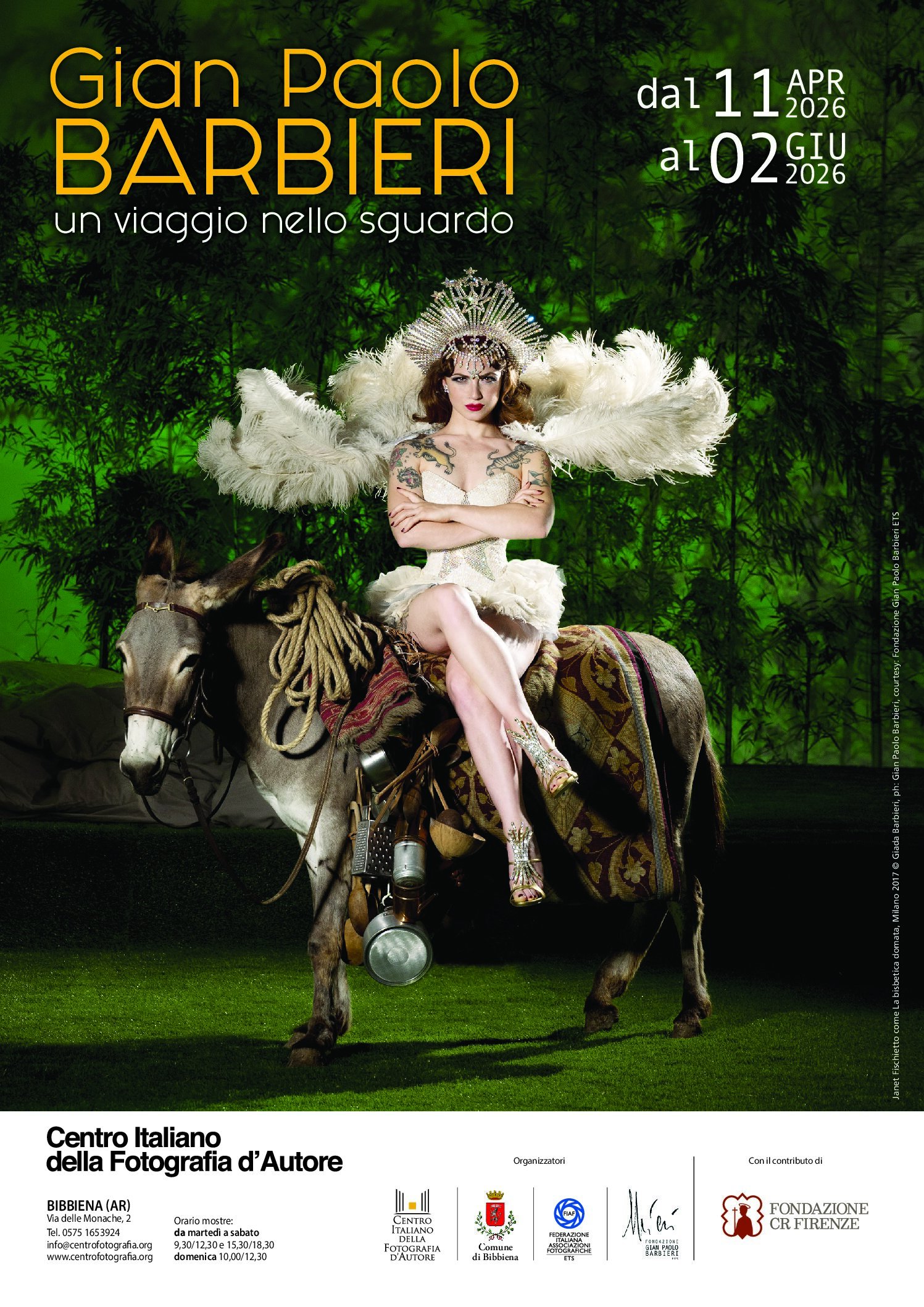La Fondazione Gian Paolo Barbieri ETS è lieta di annunciare la propria collaborazione alla mostra “Gian Paolo Barbieri. Un viaggio nello sguardo”, presentata dalla FIAF – Federazione Italiana Associazioni Fotografiche al CIFA Centro Italiano della Fotografia d’Autore a Bibbiena dall’11 aprile al 2 giugno 2026.